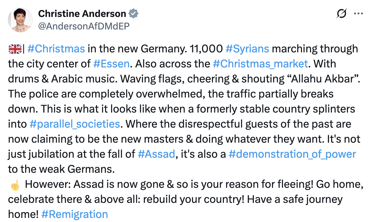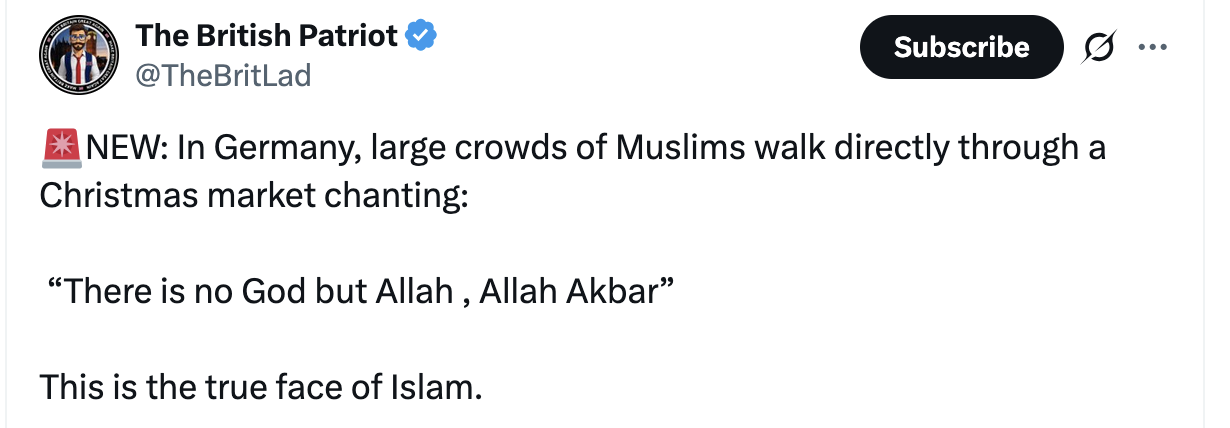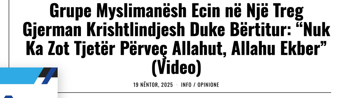 Në një artikull të publikuar në 19 nëntor pretendohet se një grup myslimanësh krijuan rrëmujë përmes një tregu Krishtlindjesh në Gjermani duke brohoritur “Nuk ka zot tjeter përveç Allahut, Allahu Ekber (Allahu Akbar)”. Pamjet tregojnë një grup të madh njerëzish që mbajnë në duar flamuj sirianë dhe ecin përmes barakave prej druri të atij që ngjan me një treg të përkohshëm.